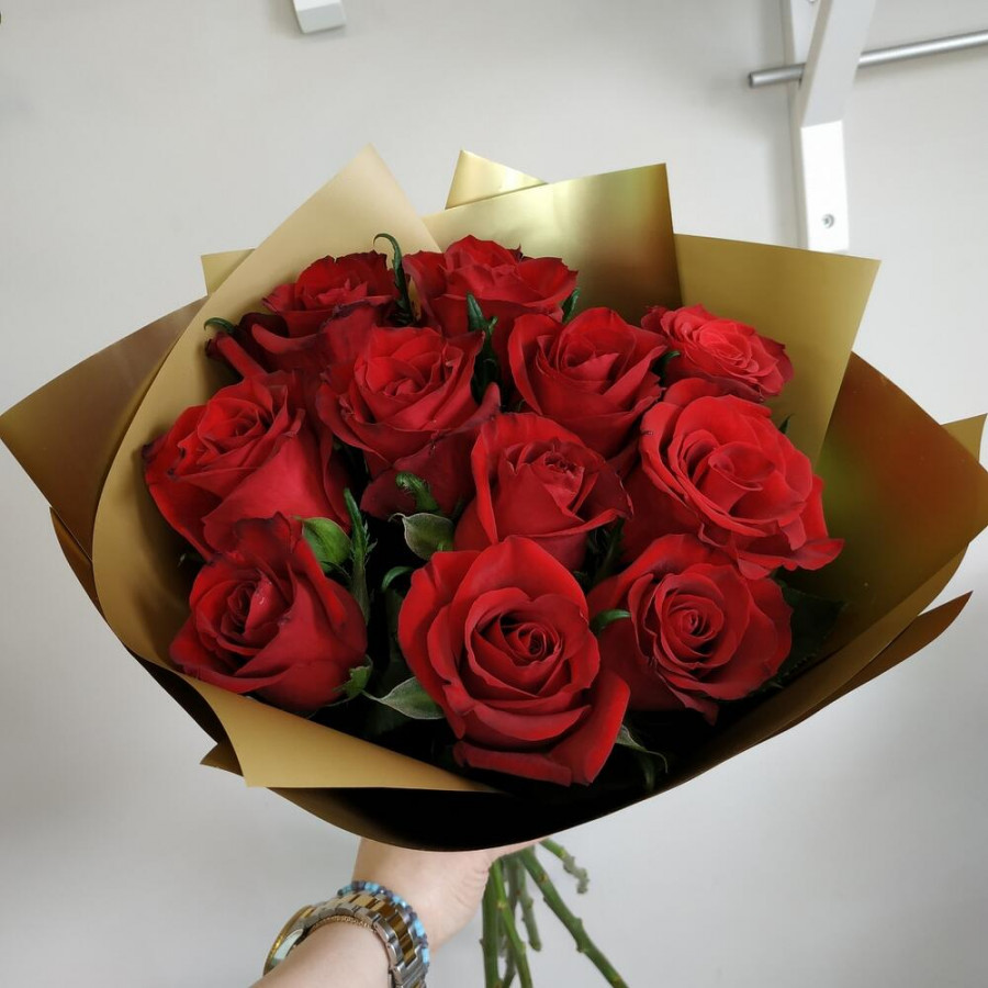 На фото букет из 11 бордовых роз. В составе: роза 11 шт, дизайнерская упаковка 1 шт, атласная лента 1 шт, . Все цветы свежие и ароматные, букет красиво оформлен и отлично подходит для подарка. Доступна доставка цветов или самовывоз.